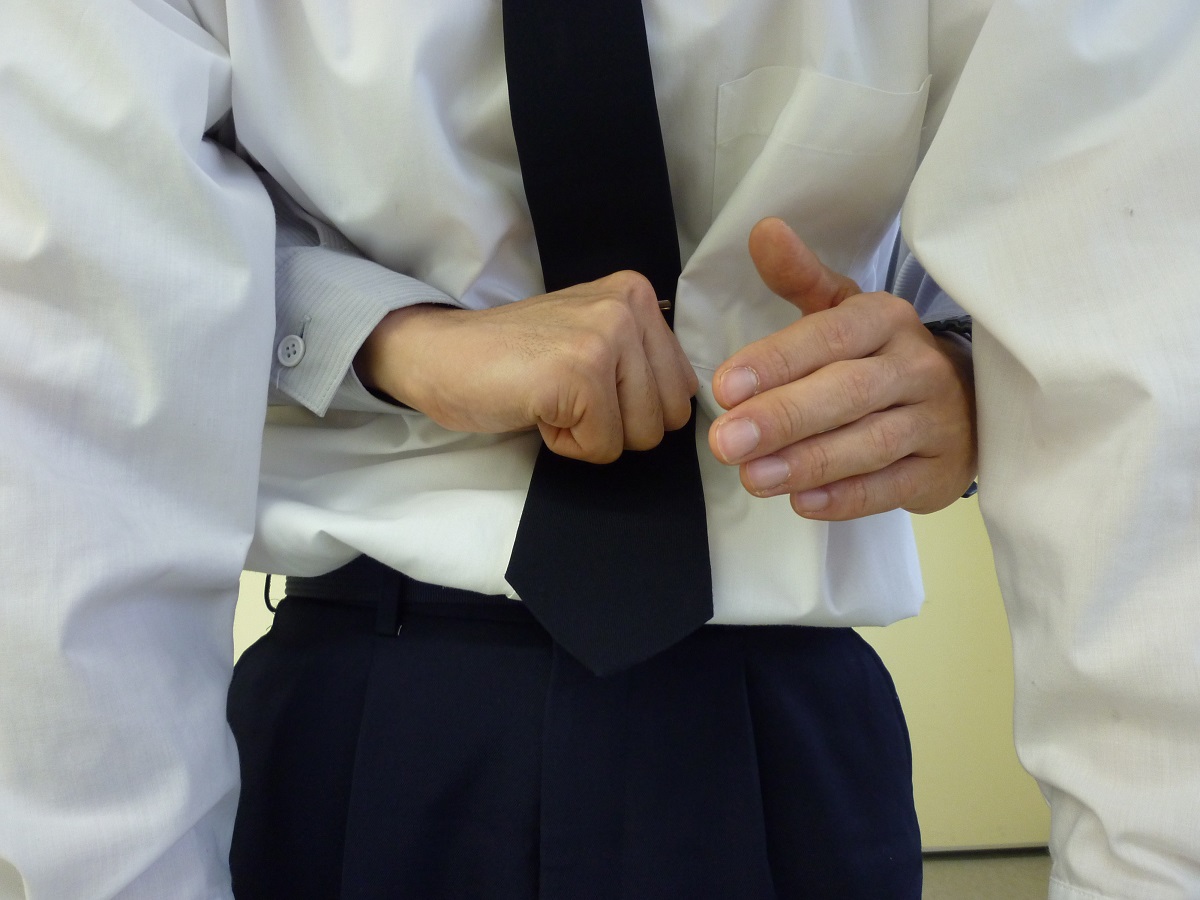 | 傷病者を後ろから抱えるように腕を回し、一方の手で握り拳を作り、親指側を傷病者のへその上方で、みぞおちより下に当てる。 | |